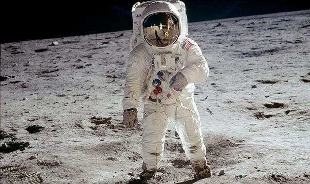 Tja, NASA was vergeten Buzz Aldrin een camera mee te geven. Alleen Neil Armstrong heeft foto’s gemaakt. Dus op alle foto’s met ‘de eerste man op de maan’ zie je Neil alleen weerspiegeld in het vizier van Buzz’ ruimtehelm.